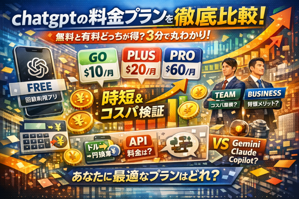ChatGPTの料金体系は、個人向けFree/Go/Plus/Proと、Team/Business/Enterpriseといった法人向けに分かれ、すべてドル建てです。多くの解説はここで止まりますが、実際に重要なのは「日本円で月額いくらになるか」ではなく、自分の業務で何時間分の時短と売上に置き換わるかという一点です。