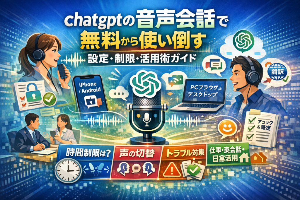 ChatGPTの音声会話は、iPhoneやAndroidアプリ、PCブラウザやデスクトップアプリから、無料でも今すぐ使える便利な機能です。しかし現場では「どこから設定すればいいか分からない」「無料の制限時間があいまい」「急に音声会話ができない」「仕事で使っていい範囲が怖い」という理由で、せっかくのAI音声機能がほとんど活用されていません。