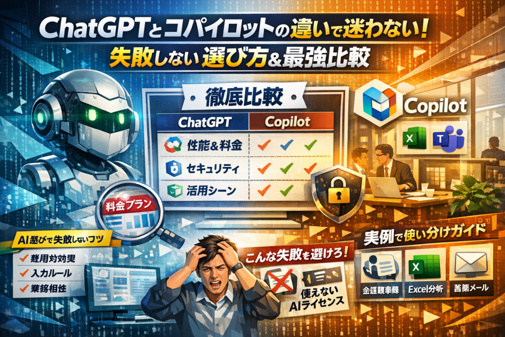 本記事は、ChatGPTとコパイロットの関係性を三行で押さえたうえで、性能と料金、用途、セキュリティを一枚の比較表で整理し、「自社ではどちらを軸にすべきか」を即決できる状態まで分解します。議事録やExcel分析、営業メール、コンテンツ制作、プログラミングなどの具体的な業務シーンごとに、CopilotとChatGPT、そしてGeminiをどう使い分けるかを明示し、「Copilot ChatGPTは同じものか」「どのプランに課金すべきか」という迷いをなくします。
