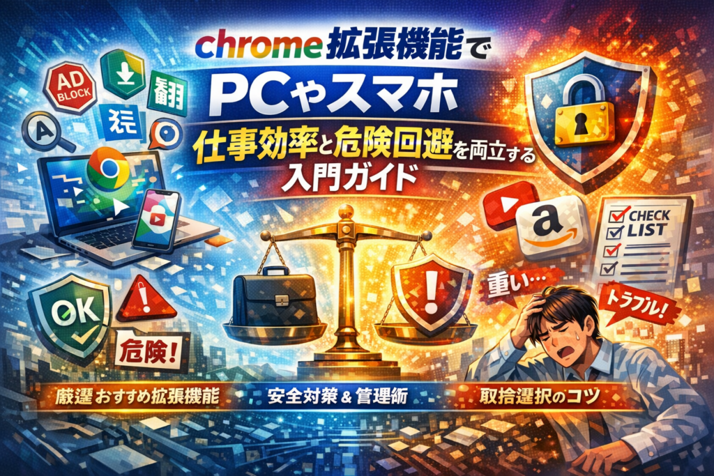本ガイドでは、Chromeウェブストアでの選択から、PCとスマホ(Android/iPhone/iPad/Chromebook)での現実的な使い分け、広告ブロックやYouTube動画ダウンロード、Amazon価格比較、翻訳・AIリーディングツールの光と影まで、実務で問題になりやすいポイントを整理します。単なる機能紹介ではなく、どこまで入れ、どこから削除するかという「適正量」と、3ヶ月ごとの棚卸し術、ブラウザ拡張機能が原因のトラブルの切り分け手順、企業でのホワイトリスト運用の考え方まで踏み込みます。