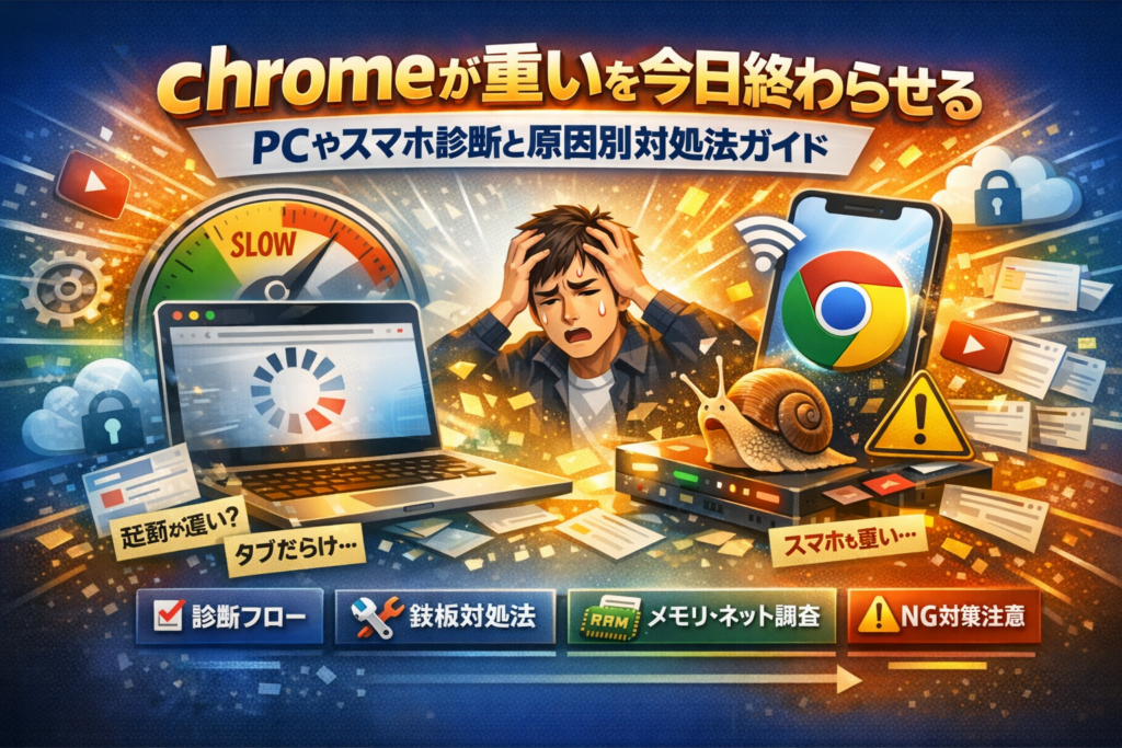 本記事では、起動が遅いのか読み込みが遅いのか、Chromeだけ重いのかPC全体が重いのかを切り分ける“診断フロー”から入り、Windows10/11とMacの鉄板対処法、AndroidやiPhoneでの改善手順まで一気に整理します。さらに、Windows11の効率モードやChromeのメモリセーバーがなぜ仕事中のSaaSやYouTubeをカクつかせるのか、特定サイトだけ激重になるときに広告ブロッカーや拡張機能がどう影響するのかを、現場で起きたパターンに沿って解説します。