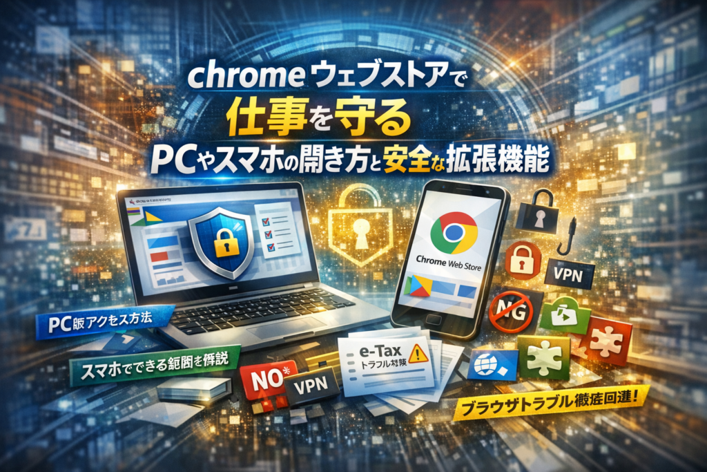 本記事では、chrome ウェブストア 開き方やchrome 拡張機能の基本だけでなく、iPhoneやAndroidで「できること・できないこと」をはっきり線引きし、スマホ版Chromeで無駄な試行錯誤をしない判断軸を示します。さらに、無料VPNや動画ダウンロード系など「入れてはいけない拡張機能」の見分け方、e-Taxや業務システムで画面が崩れるときにまず疑うポイント、chrome://extensionsとの使い分け、会社PCでの最低限のルールまで、現場で実際に使われている対処手順を整理しました。