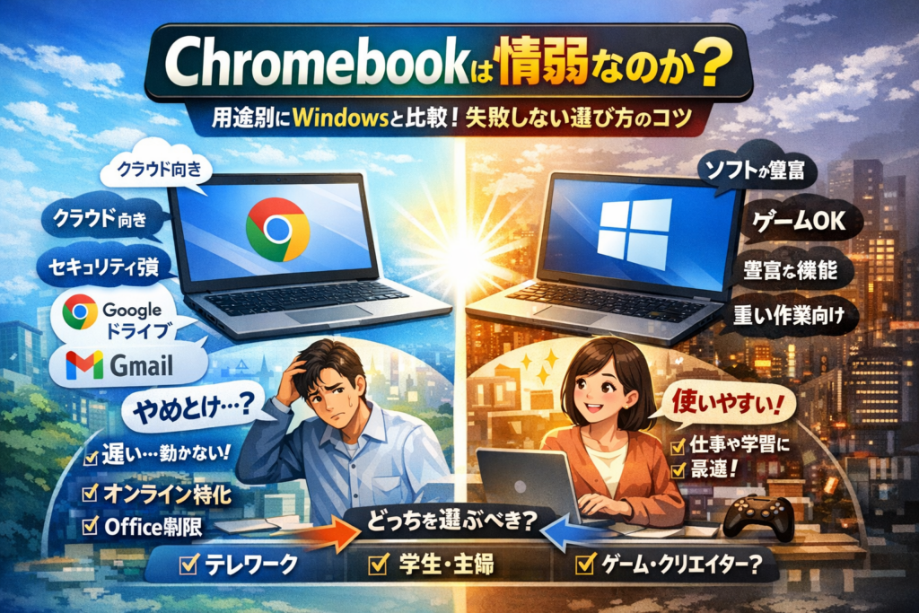 chrome bookを調べても、「安くて軽い」「やめとけ」「情弱向け」など真逆の情報ばかりで、結局Windowsとどっちが得なのか判断できないまま時間だけが過ぎていませんか。実務上の損失は、端末代そのものではなく、自分の仕事や学習に合わないOSを選んで数年拘束されることです。