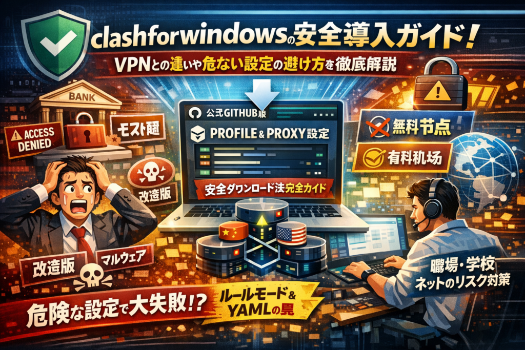 本記事は、clash for windowsの安全な導入と運用を「実務の視点」で一気通貫に整理します。どこから落とすのが安全か、改変版をどう見分けるか、ProfilesとSystem Proxyをどう押さえれば最短でつながるかを、日本語で具体的に示します。そのうえで、订阅や节点、無料节点と有料机场の違い、绕过大陆IPやRuleモードの設計思想、YAMLの典型ミス、ルーターVPNとの二重トンネルなど、現場で本当に問題になるポイントだけを抽出しています。