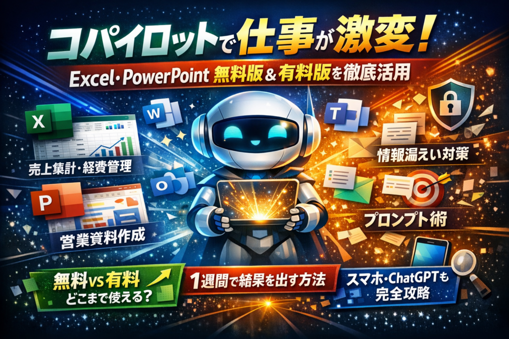 さらに、スマホ(iPhone/Android)やWindows、Edge、Bingでの起動方法、PowerPoint Copilotが表示されない・有効化できないときのチェックポイント、ChatGPTとの違い、情報漏えいリスクと社内ルールの決め方、「役に立たない」と感じる典型パターンと修正法、1週間で結果を出すアクションプランまでを一気通貫で示します。