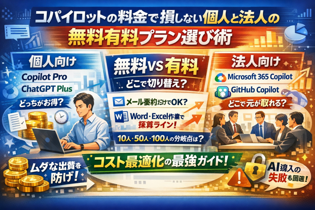 コパイロットの料金を「とりあえず全員に」「とりあえず無料版で」と決めている時点で、すでにじわじわとお金と時間を失っている可能性があります。個人向けCopilot ProかChatGPT Plusか、法人ならMicrosoft 365 Copilotか、GitHub Copilotまで含めて、どのプランを何人に入れるかで、手元に残る現金も業務効率も大きく変わります。料金表や公式解説は山ほどありますが、「無料版でどこまで戦えるのか」「どの業務から有料版に切り替えるべきか」「10人・50人・100人のどこで採算が変わるか」まで数字の筋道を示している情報はほとんどありません。この記事では、個人と法人それぞれについて、コパイロット無料版と有料版の違い、Copilot ProとMicrosoft 365 Copilot、GitHub Copilotの料金と機能の整理にとどまらず、メール要約だけで十分なケースと、WordやExcel、Teams会議要約を使った瞬間に元が取れ始めるラインを実務目線で切り分けます。さらに、よくある「全社一斉導入で誰も使わない」「無料AIツール乱立でセキュリティが崩れる」といった失敗例を踏まえ、少人数PoCから段階導入でライセンスを最適化するロジックを具体化します。読み進めれば、自分や自社にとっての「コパイロットに払ってよい金額」と「導入する順番」がはっきり言語化できるはずです。