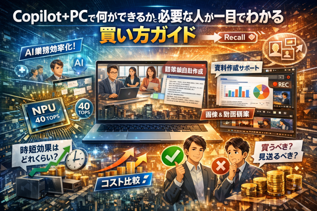 Copilot+PCが気になりつつ、「普通のパソコンと何が違うのか」「本当に自分の業務で元が取れるのか」がはっきりしないまま、買い替えのタイミングを先送りしていないでしょうか。検索結果では、Copilot+PCとは何か、NPUや40TOPSといった要件、RecallやCocreatorなどの機能紹介、オフラインとクラウド処理の違い、メリット・デメリットや「今買うべきか」が並びますが、それだけではあなたの会社や担当業務で実際に何時間ラクになり、どこで意味がないのかまでは見えません。