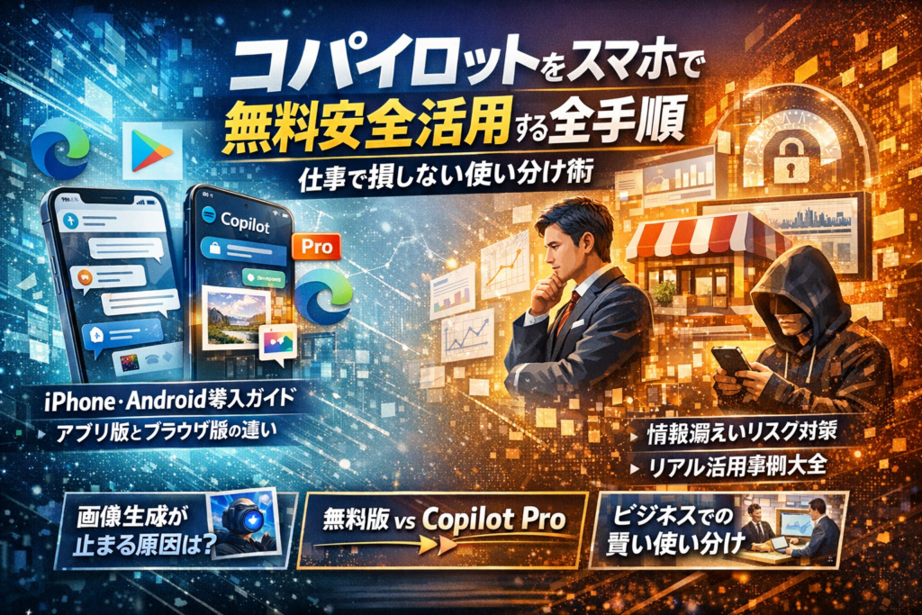 さらに、コパイロット 画像生成がスマホで使えないときの原因と対処、店舗集客やローカルSEOでの活用パターン、スタッフが勝手にAIアプリを入れることによる情報漏えいリスクまで、実務レベルで踏み込みます。この記事を読み終える頃には、コパイロット スマホを無料で安全に試しつつ、仕事で損をしない使い分けが自分で設計できるようになります。