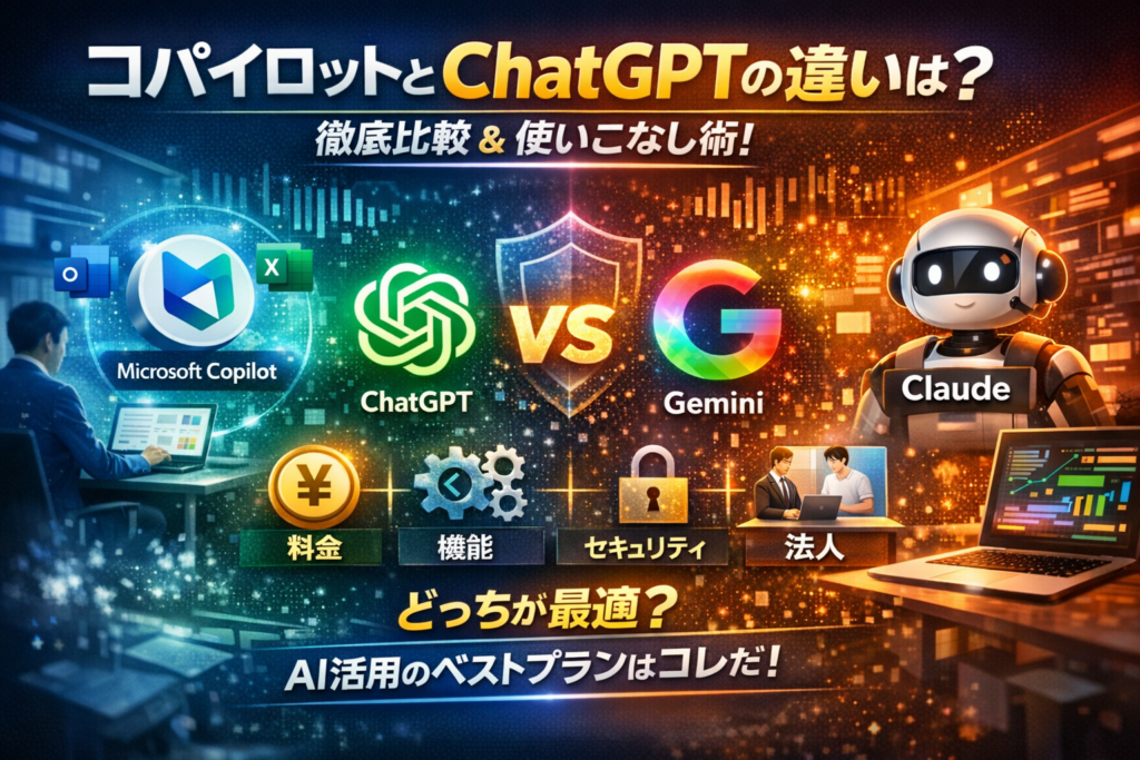このページでは、CopilotとChatGPTとGeminiの違いを、料金・機能・用途・制限・セキュリティの5軸で整理し、個人利用と法人利用それぞれで「どっちがいいか」「どう組み合わせるか」を実務ベースで解説します。プログラミング、メールや資料作成、Webコンテンツ制作、画像生成まで、場面ごとに最適な使い分けを示し、「高いおもちゃ」で終わらせない導入ステップとチェックリストも用意しました。