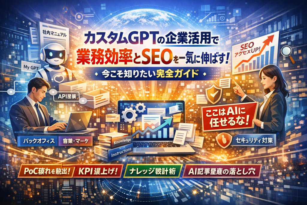 社内でChatGPTを触る人は増えたのに、業務効率も売上もほとんど変わっていない。多くの企業で起きている損失は、この一文に集約されます。AIは「便利な辞書」止まりで、社内標準のエージェント(GPTs)として設計・運用されていないことが本質的な原因です。カスタムGPTは、Knowledgeに社内マニュアルやPDF、Excelを取り込み、Instructionsとプロンプトで役割と回答品質を固定し、必要に応じてActionsやAPIでSaaSと連携させることで、単発の効率化ではなく「再現性のある業務フロー」と「SEOを含むWeb集客の仕組み」に変換できます。ところが現場では、PoCで終わる試行錯誤、GPTs乱立によるガバナンス崩壊、AI記事量産で検索評価を落とすケースが後を絶ちません。本記事では、カスタムGPTの作り方や活用例の解説にとどめず、どの業務にAIを任せ、どこは人間が最終責任を負うべきか、ナレッジ設計と設定項目をどう組み立てるか、情報漏えいを防ぎつつSEOとAIOまで一体で最適化する具体的なロジックをまとめています。読み終える頃には、「どの業務から着手し、どんな1体目のGPTを作り、どのKPIで運用するか」まで、明日から社内で合意形成できる状態になっているはずです。