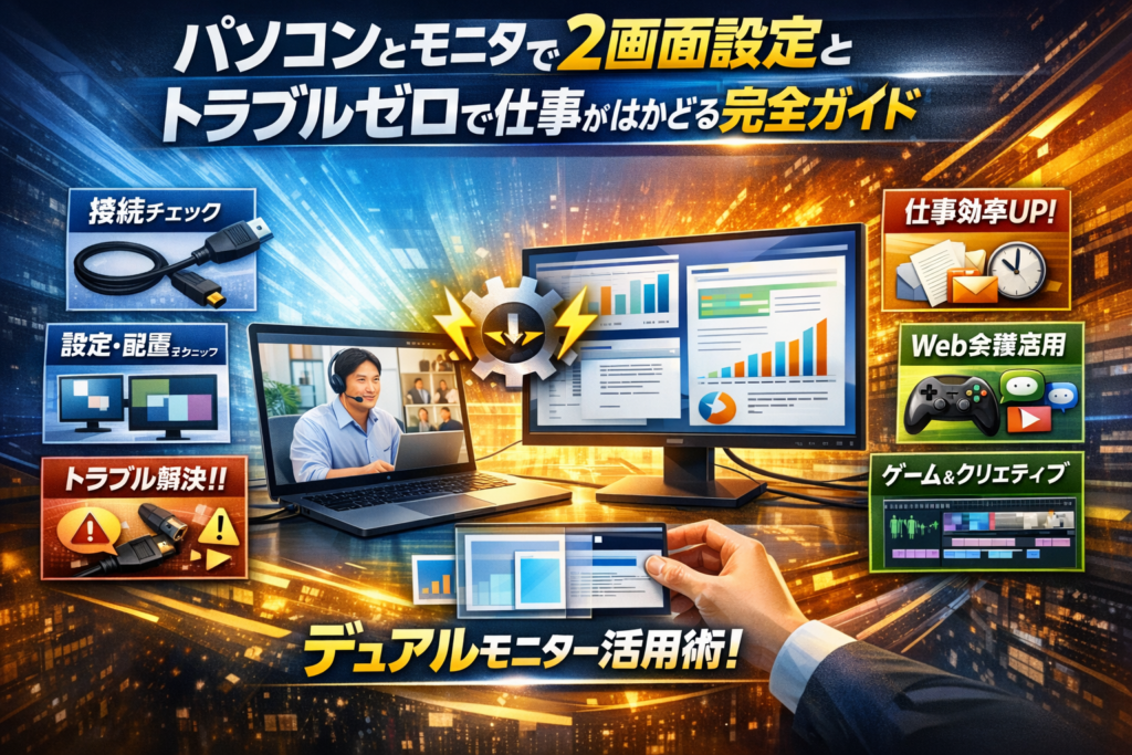 パソコンとモニターで2画面にするだけで、テレワークやWeb会議、事務作業のスピードは確実に変わります。それなのに、多くの人が「パソコン モニター 2画面 設定」で調べては、ディスプレイ2画面が検出されない、片方だけ映らない、モニター2台違う画面にできない、といったトラブルで時間を失っています。本記事は、接続→Windowsでのディスプレイ2画面設定→トラブル解決→仕事やゲームでの使い方を一気通貫で押さえ、デュアルモニターを「ただ映るだけ」から「確実に仕事がはかどる」状態まで持っていくための実務ガイドです。HDMI端子1つで2画面出力しようとして失敗するケースや、拡張と複製、セカンドスクリーンのみの違い、メインディスプレイの切り替え、マウスカーソルやウィンドウの迷子を防ぐ配置のコツまで、現場でつまずきやすいポイントを順番に潰します。ノートパソコンでもデスクトップでも、「どの端子でどう接続し、どの設定画面で何を選択すればいいか」が分かれば、再検索を繰り返す必要はありません。この記事を読み切ることが、2画面環境を投資回収できるレベルまで使い切る最短ルートになります。