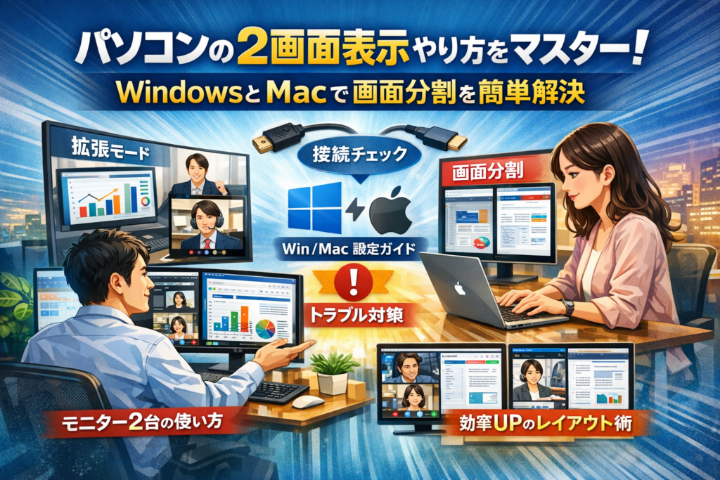 本記事は、「自分が本当にやりたい表示モードはどれか」を最初に整理し、Windows11・Windows10・Macごとの具体的な2画面表示やり方と画面2分割のショートカット、そしてトラブル時の復旧手順までを一気通貫で解決することを目的にしています。