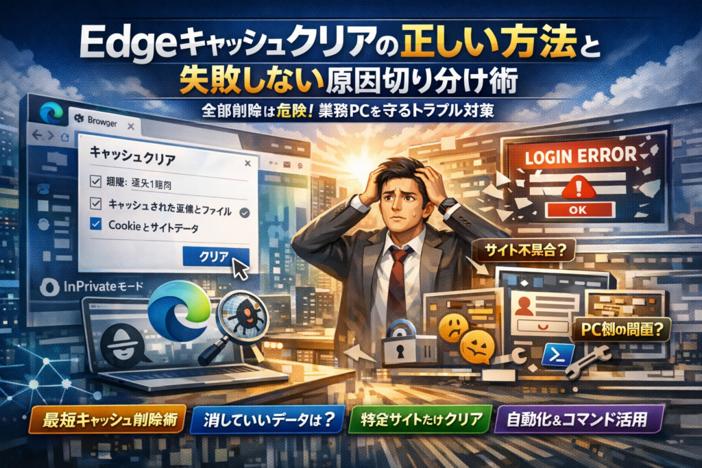 このガイドでは、Windows10/11共通の基本操作から、特定のサイトだけキャッシュクリアする方法、コマンドやPowerShellによる自動化の是非、Edge更新後に一部ユーザーだけ不具合が出るときの原因切り分けまで、業務PCで失敗しないための判断軸を先に提示します。「edge キャッシュクリア できない」と悩む前に、InPrivateウィンドウや別デバイスでどこまで切り分けられるかも、実務フローとして整理しました。
