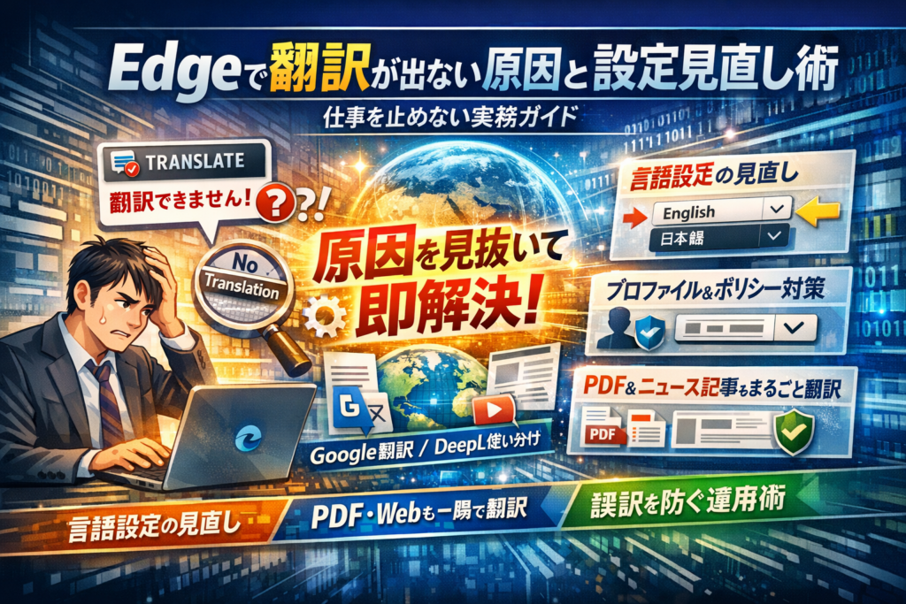 「Edgeの翻訳が出ない」たったこれだけで、海外サイトの調査も、英語PDFの確認も、その日の仕事が止まります。多くの人は「Microsoft Edge翻訳 できない」「Edge 翻訳機能 オン」「Edge 自動 翻訳 設定」と再検索を繰り返し、断片的な対処法だけを拾って終わります。その結果、同じトラブルが何度も再発し、誤訳に気づかないまま資料やメールに使ってしまうリスクだけが静かに積み上がります。