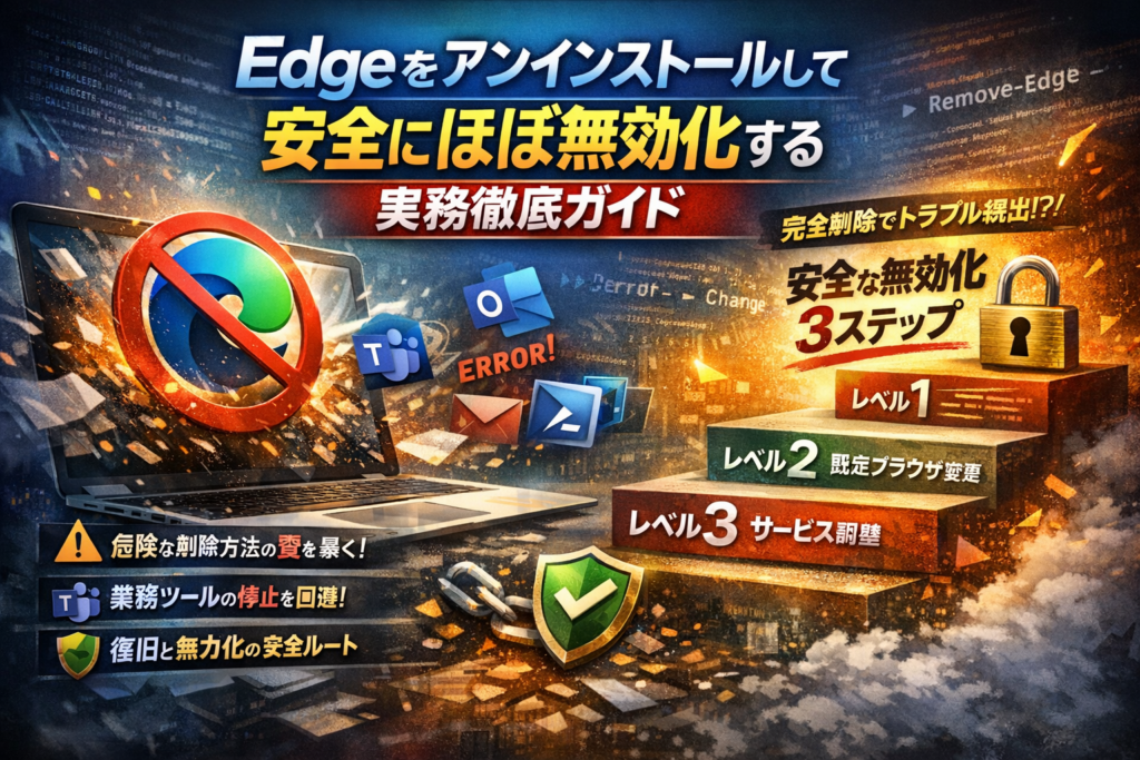 本記事は、Windows10/Windows11でのMicrosoft Edgeアンインストールを「方法論」ではなく「リスク配分」として分解します。edge アンインストール 強制、Microsoft Edge 無効化、PowerShellやレジストリ編集、WebView2 Runtime巻き込みによる後出しトラブル、再インストールできないケースまで、現場で実際に起きているパターンだけを扱います。その上で、完全削除に頼らず「安全にほぼ無力化する」3段階の現実解を提示します。