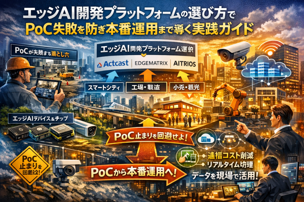 エッジAI開発プラットフォーム選びを誤ると、PoCまではそれらしく進んでも、本番展開の直前でプロジェクトが止まり、投下した予算も現場の信頼も静かに失われます。カメラやセンサーなどのエッジデバイス側でAIをリアルタイム処理できる基盤自体は、ActcastやEDGEMATRIX、AITRIOSといった選択肢が揃い、JetsonやCoralなどのエッジAIチップも充実しています。しかし、通信コストやレスポンス、プライバシーのメリットだけをなぞっても、製造現場やスマートシティ、小売・観光のユースケースは「データはあるのに何も変わらない」DXに陥りがちです。