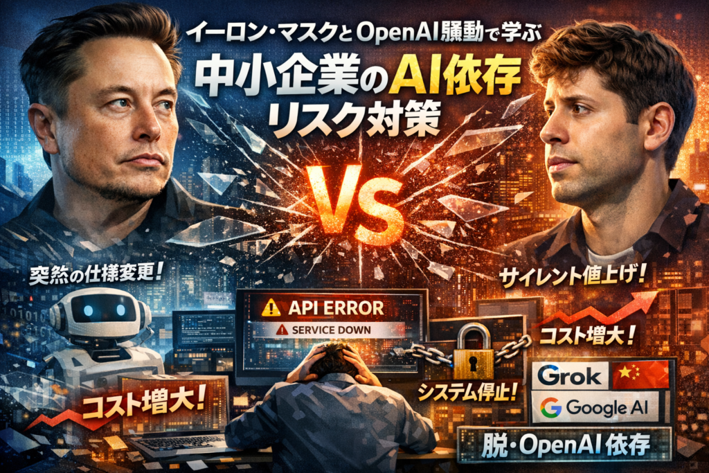 この記事では、イーロン・マスクとOpenAIの関係・提訴・買収騒動を時系列で整理しつつ、それが日本の中小企業のAI依存リスクにどう直結するのかを、Web制作とAI実装の現場目線で分解します。単一ベンダー依存を避ける複数AI設計、マイクロソフト・ソフトバンクなど出資構造の読み方、xAIに「全部乗り換え」しないための距離感までを、一つの地図として手元に残せる内容です。
