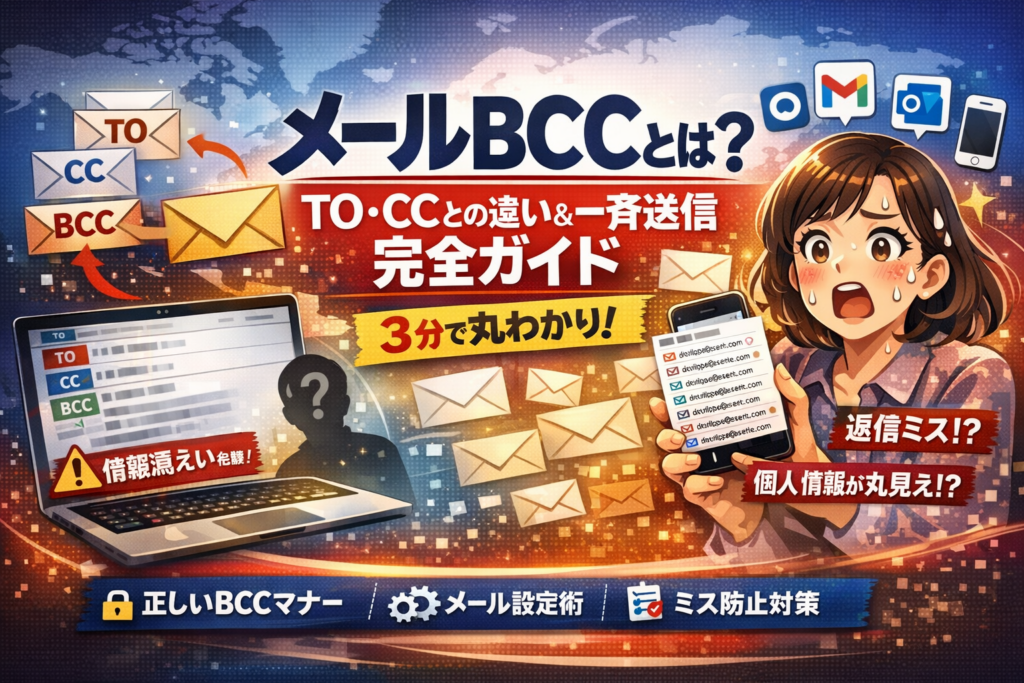本記事では、メールBCCとは何かを一言で押さえつつ、to cc bccとは何か、ccとbccとはどう違うのかを「誰が宛先で誰が共有か」という実務目線で整理します。そのうえで、BCCメール返信の落とし穴、BCCメールマナーと「BCCでお送りしております」の正しい使い方、GメールBCCの出し方やアウトルックBCCの場所、iPhoneメールのCC/BCC設定までを、3ステップで迷わず使えるレベルに落とし込みます。さらに、学習塾やサロンなど中小企業で実際に起きたbcc送信ミスのパターンから、二度と同じ失敗をしないための社内ルールと仕組み化の考え方まで一気に整理します。この記事を読み終えた瞬間から、「宛先ミスの不安」と「BCC運用のモヤモヤ」をゼロにできるはずです。
