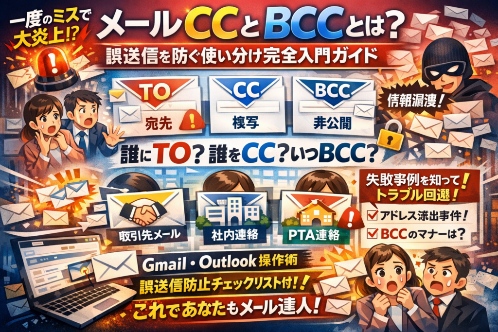 本記事では、メールのTO CC BCCとは何かを、図解イメージで一度で覚えられるよう整理し、社外メール・社内メール・PTA連絡などシーン別に「誰を宛先に、誰をCCに、BCCメールはどんな時に使うか」を具体的に示します。さらに、「BCCは失礼ですか」「BCC使わない方がいいケースは」など、知恵袋では割り切れないグレーゾーンも、実務の落とし所まで踏み込みます。