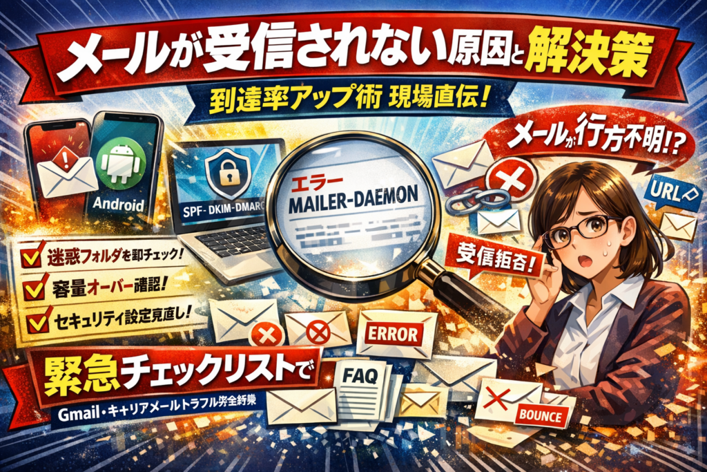 本記事では、iPhoneやAndroidでメールが受信されないときの「最初の5分チェック」から、Gmailで受信トレイに表示されない隠れフォルダ、Outlookやパソコンメールのセキュリティソフトの影響、docomoやauなどキャリアメールでURL付きメールが止まる理由までを、原因別に一気通貫で整理します。さらに、送信側の「アドレスは合っているのにメールが届かない」問題を、エラーメールやバウンドの読み解き方、SPF・DKIM・DMARC設定、メルマガやステップメールの配信設計まで踏み込み解説します。