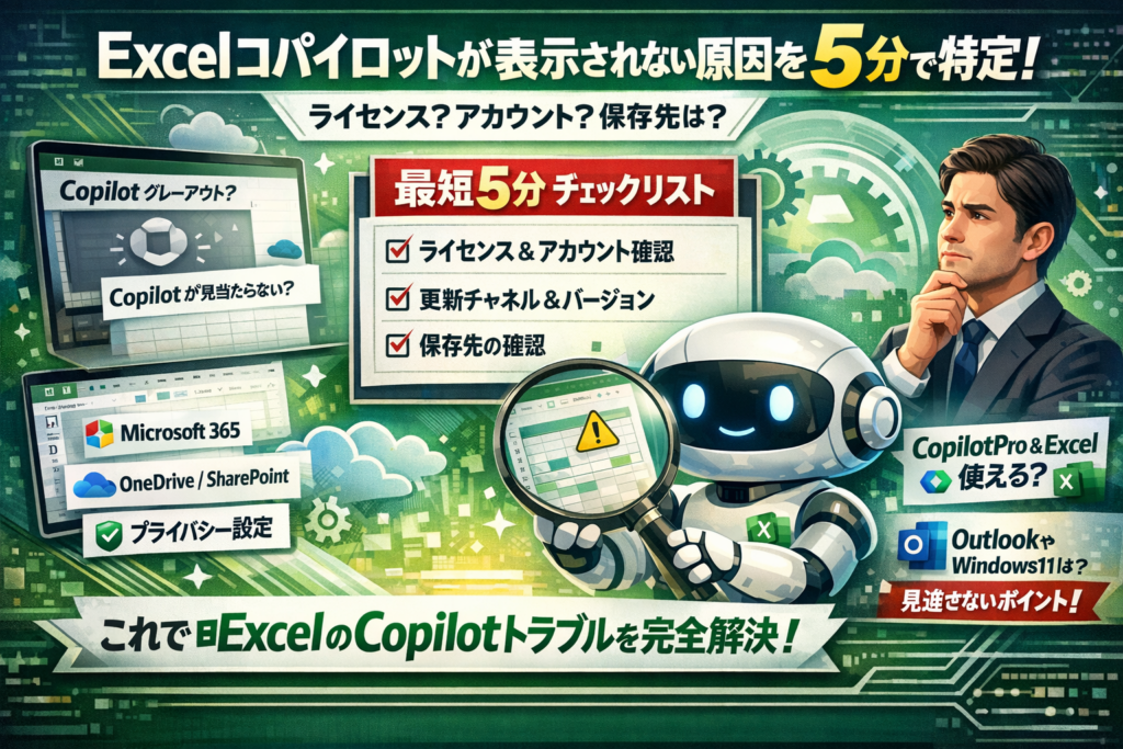 Excelを開いてもExcelコパイロットが表示されない。Copilotアイコン自体が見当たらない、グレーアウトして押せない、特定ファイルだけ反応しない。そのたびに「Excel Copilot どこ」「Excel Copilot 有効化」「Microsoft 365 Copilot 表示されない」と検索し直し、設定画面をさまよう時間は、すべて失われた生産性です。しかも多くの場合、原因は再インストールではなく、ライセンスとアカウント、更新チャネル、保存先やプライバシー設定といった目に見えないレイヤーの噛み合わせ不良にあります。