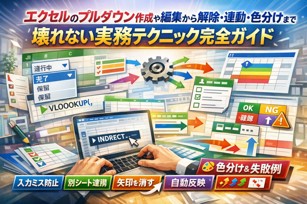 本記事は、エクセルのプルダウン(ドロップダウンリスト)について、作り方や設定だけでなく、編集や追加、削除や解除、矢印を消すデザイン調整、別シート連動、自動入力、条件付き書式による色分けまでを一気通貫で整理しています。データの入力規則の正しい使い方、テーブルや名前の定義で壊れないシートにする方法、VLOOKUPやINDIRECTを使った連動、自動反映の考え方も、現場で多い失敗事例とセットで解説します。