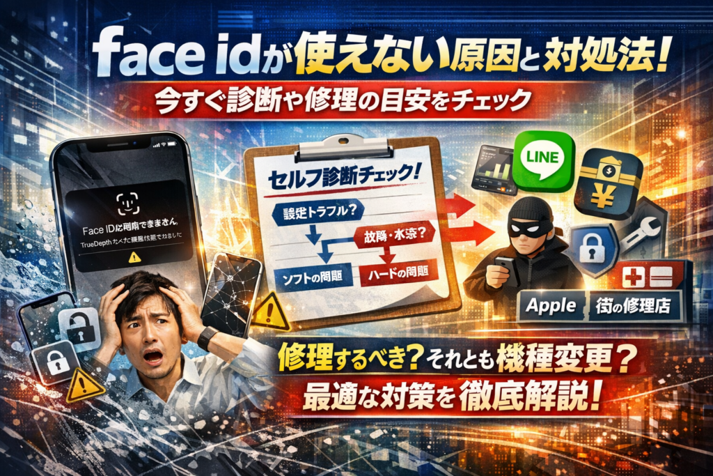 このページでは、Face IDが使えない原因を「設定やiOSの問題」「水没や落下、保護フィルムなどハード側の故障」「盗難デバイスの保護や中古iPhoneの制限」に分けて、今の症状から逆引きできるセルフ診断フローチャートを用意しました。どの段階まで自分で対処し、どこから修理や店舗相談に切り替えるか、Appleと街の修理業者、機種変更の費用感まで含めて修理するか諦めるかの判断軸を具体的に示します。