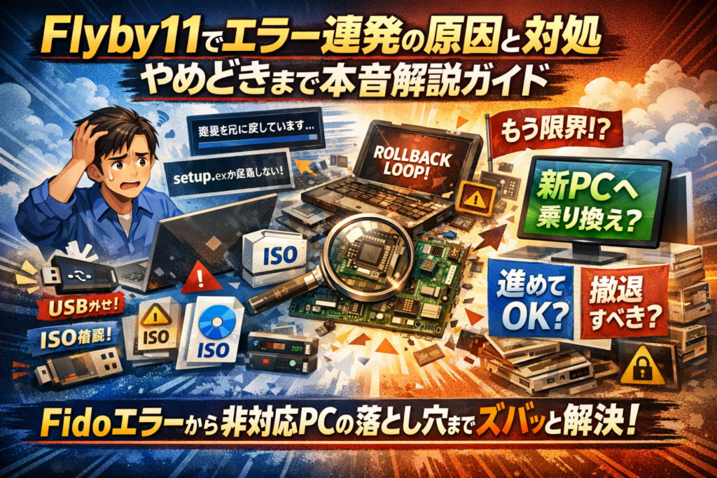 このガイドでは、Flyby11のエラーメッセージとフェーズを手掛かりに、USBやISOの初歩的なミスから、CPU・TPM・SecureBoot不足、Fidoの過剰アクセス、回線やSSDのボトルネックまでを一気に切り分けます。そのうえで、家族共用や仕事用PCでの危険なパターン、中古PCや非対応PCにありがちな「やってはいけない条件」、Flyby11に頼らない代替策、新PCへの乗り換え基準までを「どこで引き返すか」とセットで整理しました。