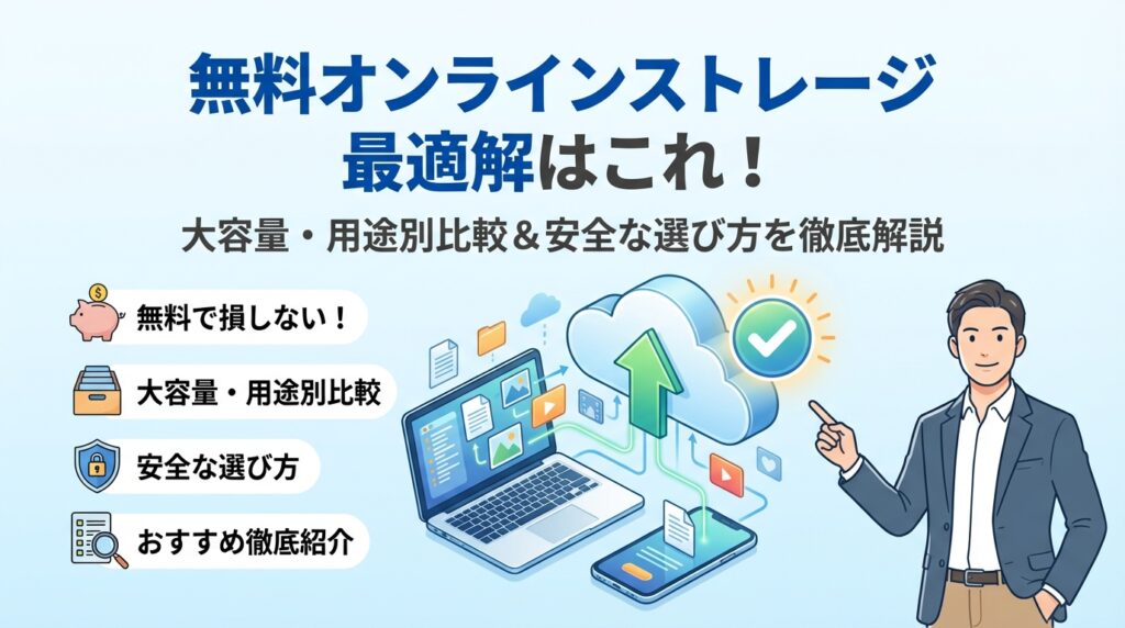 スマホの写真や動画で容量が限界、仕事のファイル共有もとりあえず無料オンラインストレージでしのいでいる。そんな状態のままだと、「どこに何を置いたか分からない」「気づいたらリンク共有のまま放置」「保存期間切れでデータ消失」という、見えない損失が静かに積み上がっていきます。多くの比較サイトは「オンラインストレージ 無料 おすすめ」「クラウドストレージ 無料 比較」「容量無制限の無料オンラインストレージ」といった表面的なキーワードで、無料容量や大容量かどうかだけを並べています。しかし、実際に結果を左右するのは、用途別の設計と運用ルールです。写真クラウドサービス無料で十分な場面と、1TBクラウド無料や動画クラウド無制限無料をうたうサービスに踏み込むべきでない場面。Google DriveやOneDrive、Dropbox、Box、MEGAなどの無料ストレージサービスをどう組み合わせれば、個人も法人も「安全に」「長期的に」データを守れるのか。本記事では、無料オンラインストレージと登録不要のファイル共有サービスの違い、容量無制限無料のカラクリ、無料から有料クラウドストレージへ切り替える判断基準まで、現場で実際に起きたトラブルから逆算して解説します。読み終えたときには、今使っている無料ストレージを「どこに、どこまで、何に使うか」が一気に整理され、無駄なリスクと迷走を削れる状態になっているはずです。