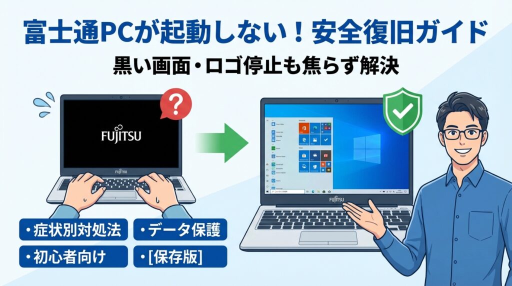 経営の現場では「パソコンが起動しない」だけで、売上計上も請求書発行も止まり、在宅勤務中なら社員が丸1日動けなくなることがあります。私自身、締切直前に富士通のデスクトップが黒い画面のまま動かず、焦って再起動を繰り返し、結果として保存していたデータへのアクセスが難しくなった苦い経験があります。