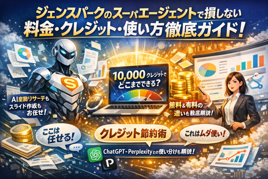 ChatGPTやPerplexityとの違い、パワポが崩れる典型パターン、ログインできない時やクレジット確認・回復の対処法まで含めて、導入判断と日々の運用設計に必要な情報だけをまとめました。ここを押さえずに使い続けること自体が、すでに損失です。続きを読めば、ジェンスパーク スーパーエージェントで「どこまで任せていいか」が即断できるようになります。