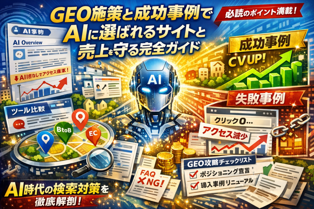 本記事では、GEO施策の一般論ではなく、実際に成果が出た成功事例と失速した失敗事例の両方を、BtoBのSaaS比較、BtoCやEC、オウンドメディア、ローカルビジネスまで横断して解剖します。FAQ量産やMEO偏重で逆効果になったケース、ツール比較ページや導入事例を再設計して指名検索とCVを取り戻したケースを、情報設計という観点で整理します。