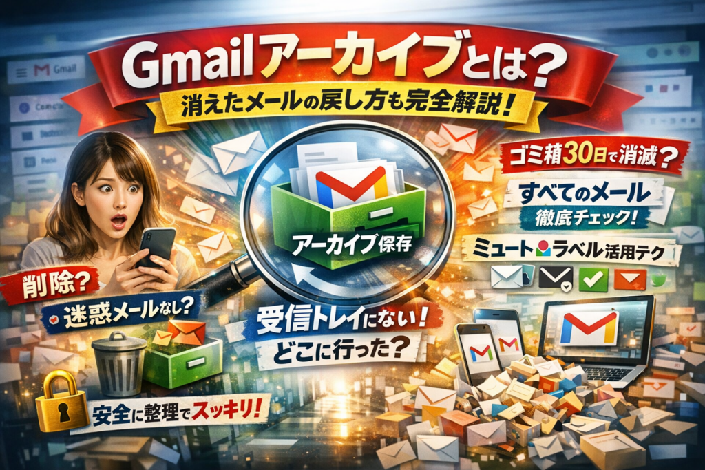受信トレイからメールがスッと消えた瞬間、「やばい、削除したかも」と血の気が引く人は多いです。ところが多くの場合、そのメールは消えておらず、単にアーカイブされているだけです。仕組みさえつかめば、怖いボタンではなく「受信トレイを片づけながら、記録はきちんと残す」ための最強ツールになります。