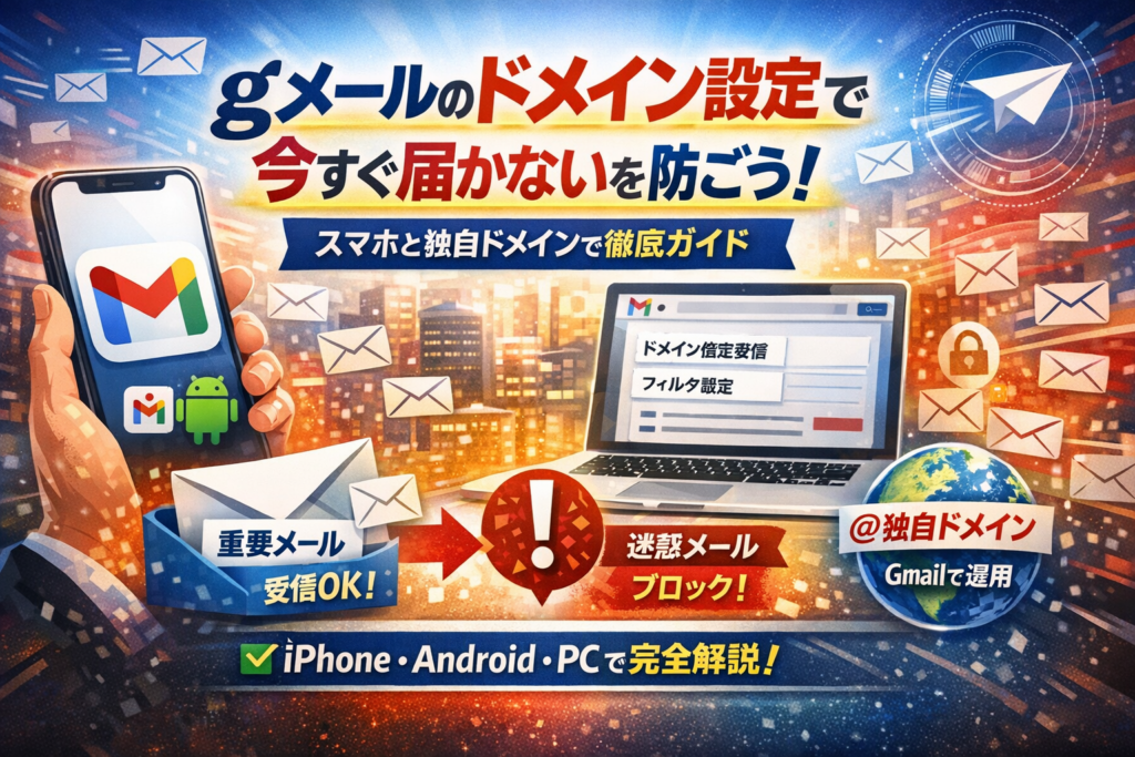 本記事では、gメールのドメイン設定がどこにあり、何をどう設定すれば「確実に届く状態」になるのかを、スマホとパソコン、iPhoneとAndroid別に具体的な手順まで落とし込みます。gメールのドメイン受信設定やドメイン解除、迷惑メールにしない設定、フィルタの使い方を一通り押さえれば、「設定したのに届かない」原因も自分で切り分けられます。
