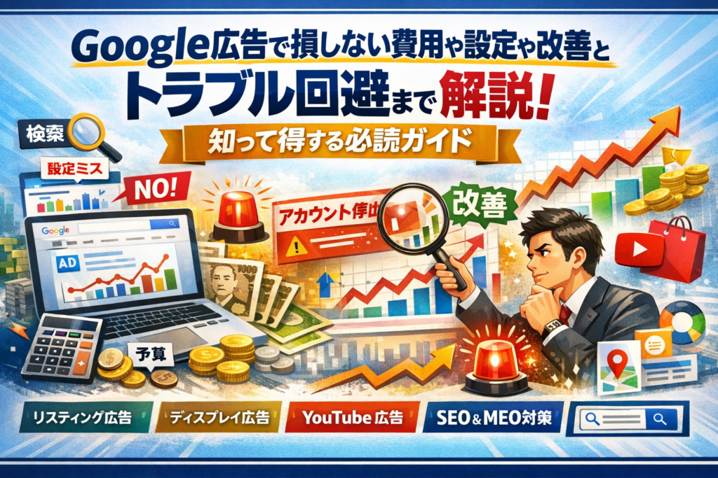 本記事では、google広告アカウント作成から管理画面へのログイン、検索広告とディスプレイキャンペーンの分け方、広告グループとキーワードの設計、日額予算と撤退ラインの決め方、費用の仕組み、よくあるアカウント停止や身に覚えのない請求トラブルの回避まで、中小企業が広告費で損しないための実務ロジックだけを整理しました。AI任せのP-MAX前に必ずやるべき準備や、SEO・MEO・ホームページとの連携で広告効果を底上げする戦略も具体的に解説します。