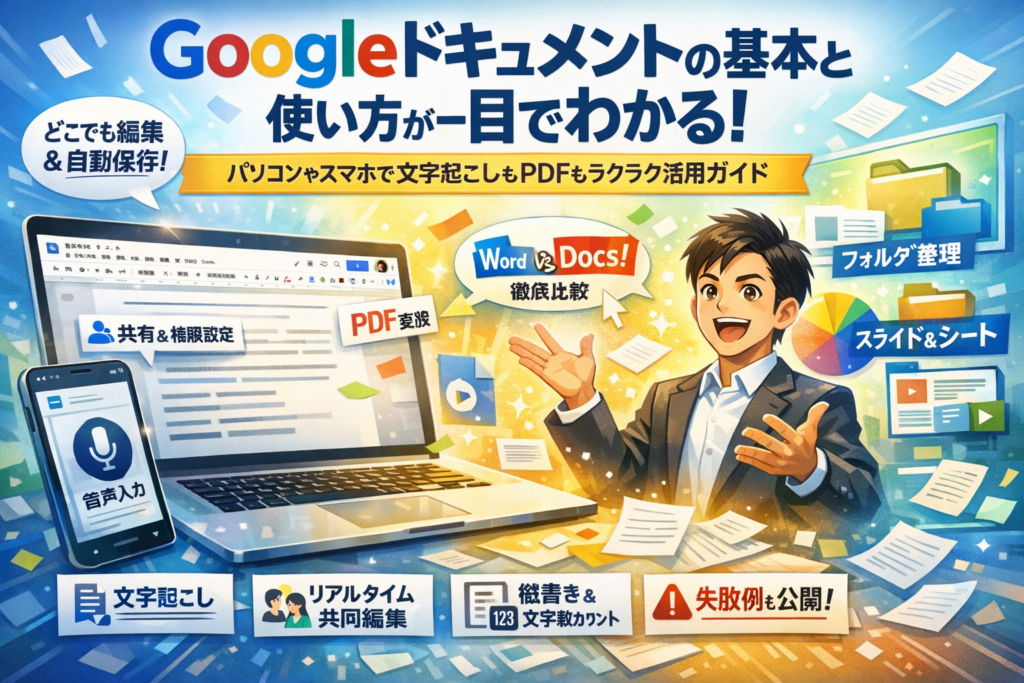 このガイドでは、googleドキュメントとは何か、無料でどこまでできるのかを押さえたうえで、パソコンとスマホ・iPhone・iPadでの新規作成と保存方法、共有とアクセス権限の決め方を失敗例込みで整理します。さらに、議事録やインタビューで役立つ文字起こし・音声入力、PDF変換、文字数カウント、縦書き、余白設定、取り消し線といった「ピンポイント機能」を、実務の流れに沿って一気に使いこなせるようにします。