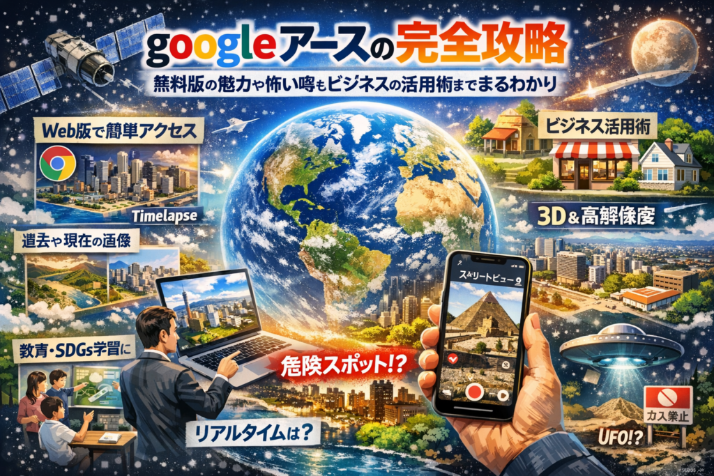 アクセスページにグーグル アースやGoogleマップを何となく埋め込んで終わっているなら、集客のチャンスを静かに捨てています。googleアースは「世界を眺める無料ツール」ではなく、使い方次第で店舗や不動産、観光、教育現場の成果を変える実務ツールです。この記事では、インストール不要のgoogleアース web版の入り口から、iPhone/Androidアプリの便利な操作、Google Earth Proやgoogleアーススタジオの違いと使いどころ、ストリートビューや過去画像・Timelapseの活用までを、やりたい事ベースで整理します。さらに「googleアース 怖い」「調べてはいけない場所」「リアルタイム」の噂を、衛星画像や航空写真の仕組み、プライバシー配慮の実態から冷静に解剖し、安全に楽しむためのラインも示します。最後に、Googleビジネスプロフィールやマップとの優先順位、地図コンテンツを集客装置に変える導線設計まで具体化します。単なる使い方の解説ではなく、どこまで無料で何をすべきかが一気に整理できる内容なので、ここでの理解が今後のWeb施策の土台になります。