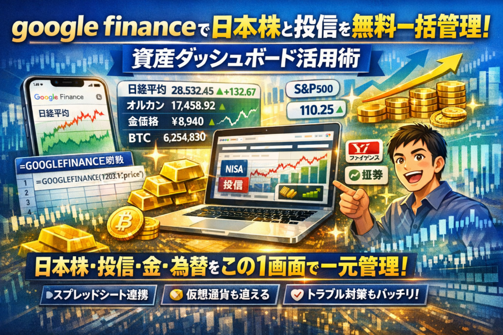 あなたの資産管理が面倒な理由は、証券会社アプリ、Yahoo!ファイナンス、スプレッドシートをバラバラに眺めているからです。google financeとGOOGLEFINANCE関数を軸に「日本株と投資信託とオルカンと金価格と為替」を一画面で追えるようにすると、日々の判断コストと見落としリスクが一気に下がります。