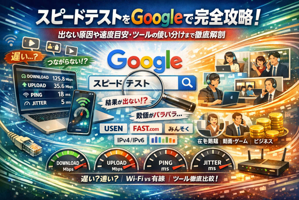 本記事は、ブラウザから使うGoogleインターネット速度テストの起動方法と、「スピードテスト googleが出ない・できない」原因の潰し方を最初に整理し、DOWNLOAD/UPLOAD/PING/JITTERを生活と仕事に直結する指標として読み解きます。そのうえで、用途別のMbps目安を在宅勤務・動画視聴・オンラインゲーム・クラウド業務ごとに線引きし、「自分の回線は本当に遅いのか」を具体的に判断できる状態まで持っていきます。さらに、Googleの速度測定とUSENスピードテスト・Fast・みんそくの賢い使い分け、IPv6対応やWi‑Fiと有線の違い、ページ表示速度が売上や予約率に与える影響まで、現場で使えるロジックに落とし込んで解説します。ネット環境のモヤモヤを一度で整理したいなら、このまま読み進めてください。