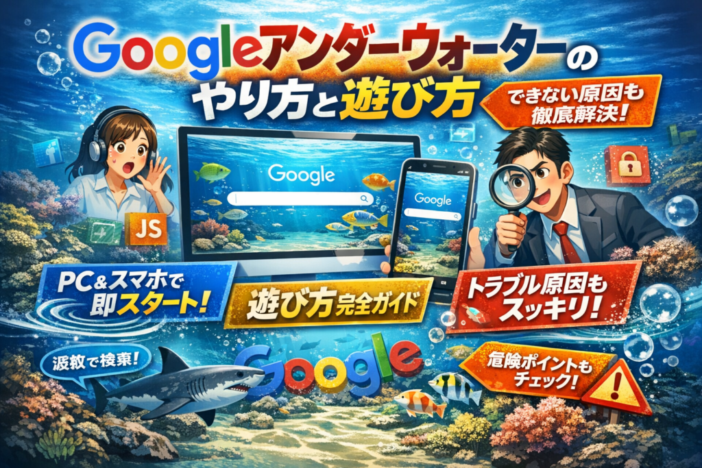 本記事では、PCとスマホ別の最短の起動手順と遊び方を先に示し、そのうえで「会社や学校だと真っ白になる」「スマホだと固まる」といった典型的な詰まりを、JavaScript設定やWebフィルタなど現場で本当に起きている原因からつぶしていきます。さらに、公式終了後に残ったelgooG系のgoogleアンダーウォーター searchが安全に使えるか、どこまでが危険かを具体的に線引きします。