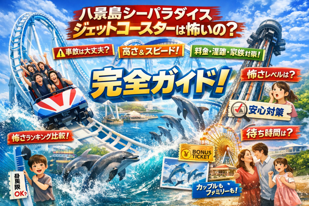 このガイドでは、八景島シーパラダイスジェットコースターの高さや速度、怖さランキング上の位置づけから、過去の事故と現在の安全対策、身長制限と3歳からの料金、サーフコースターとブルーフォールなど落下系アトラクションの違い、混雑と待ち時間の傾向、チケットと割引の損得、カップル・ファミリー別モデルコースまでを「乗るかどうか」「どう回るか」を一度で決め切れる順番で整理しています。読み終えた時点で、あなたと一緒に行く人にとっての最適解がはっきりし、再検索に追われない状態まで持っていきます。