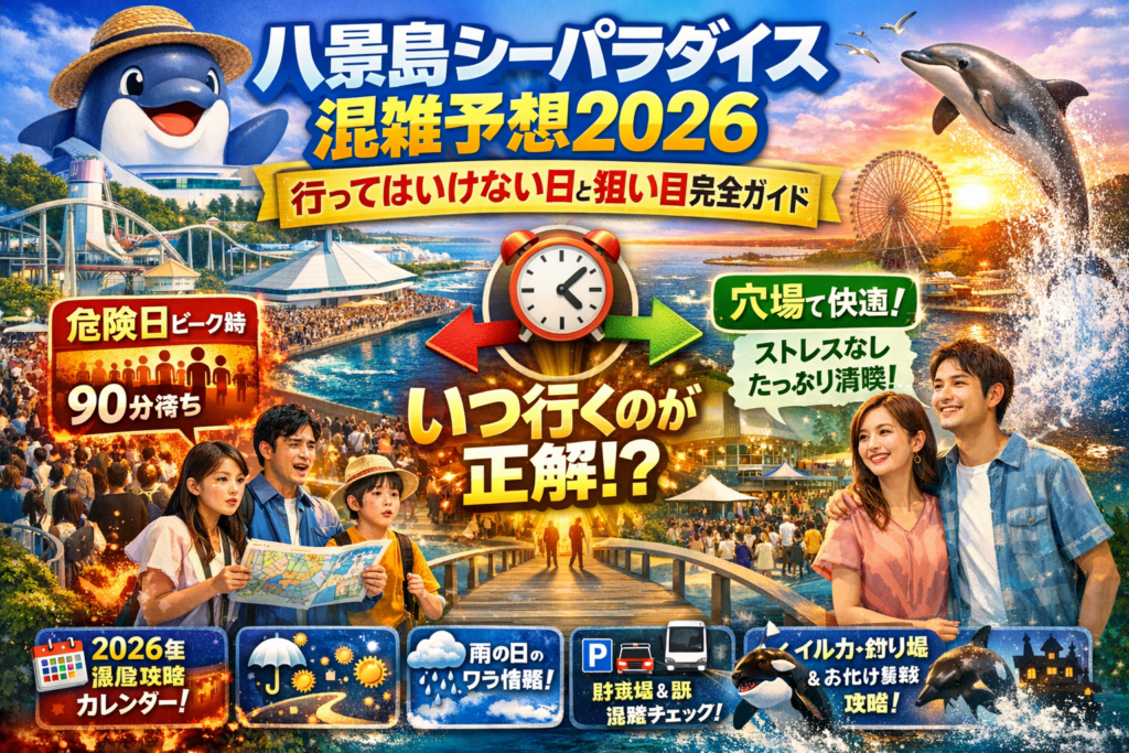 本記事は、2026年の年間カレンダーから曜日別・時間帯別のピーク、雨の日と三連休の「穴場」と「危険日」、駐車場と最寄り駅の混雑、イルカショーやお化け屋敷、釣り堀(うみファーム)までを一つのロジックで束ね、「危ない日を外しつつ、家族やカップルが無理なく楽しめる一日の設計図」を示します。単なる混雑予想ではなく、複数のデータとリアルタイム情報をどう組み合わせれば、2026年のシーパラで失敗せずに済むのか──その具体的な判断基準を、最初から最後まで通しで手に入れてください。