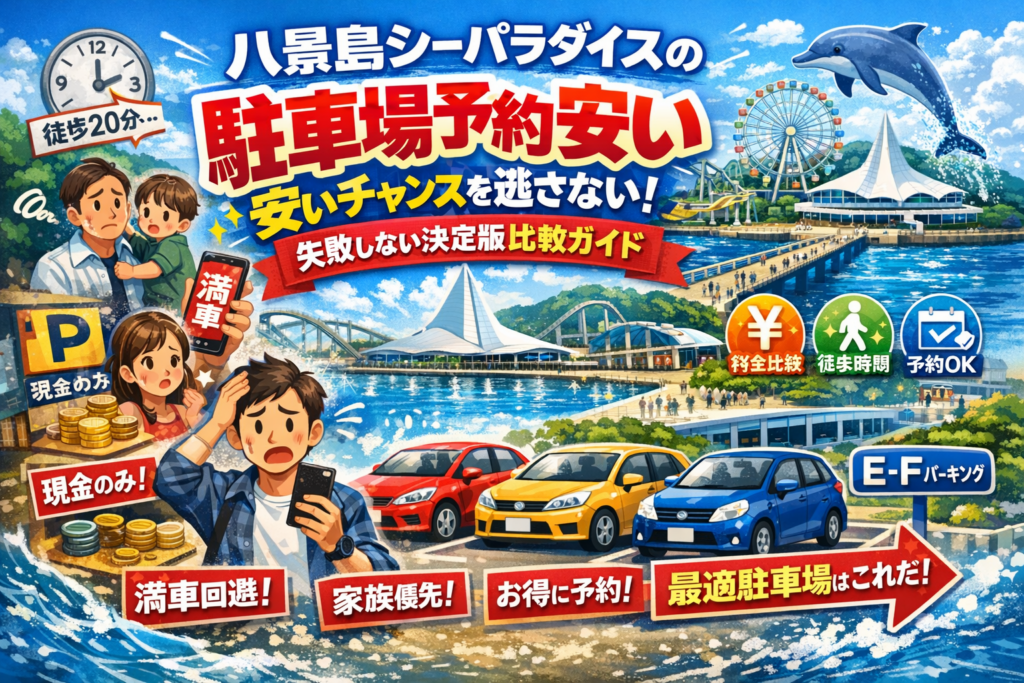 本記事では、公式A・B・C・海の公園E・Fと周辺パーキング(福浦や海辺の散歩道@横浜駐車場など)を料金相場×徒歩時間×予約可否×安心感で中立に比較し、「どの時間に着けばどの駐車場がベストか」をシーン別に整理します。さらに、混雑予想から到着時間の黄金法則、電車アクセスやシーパラきっぷとのトータル比較まで踏み込むことで、「そもそも自動車で行くのが得か」を数字ではなく体験価値で判断できるように設計しました。駐車場どこがいいかで迷って再検索を繰り返す前に、この一記事で八景島シーパラダイスの駐車場選びを完結させてください。