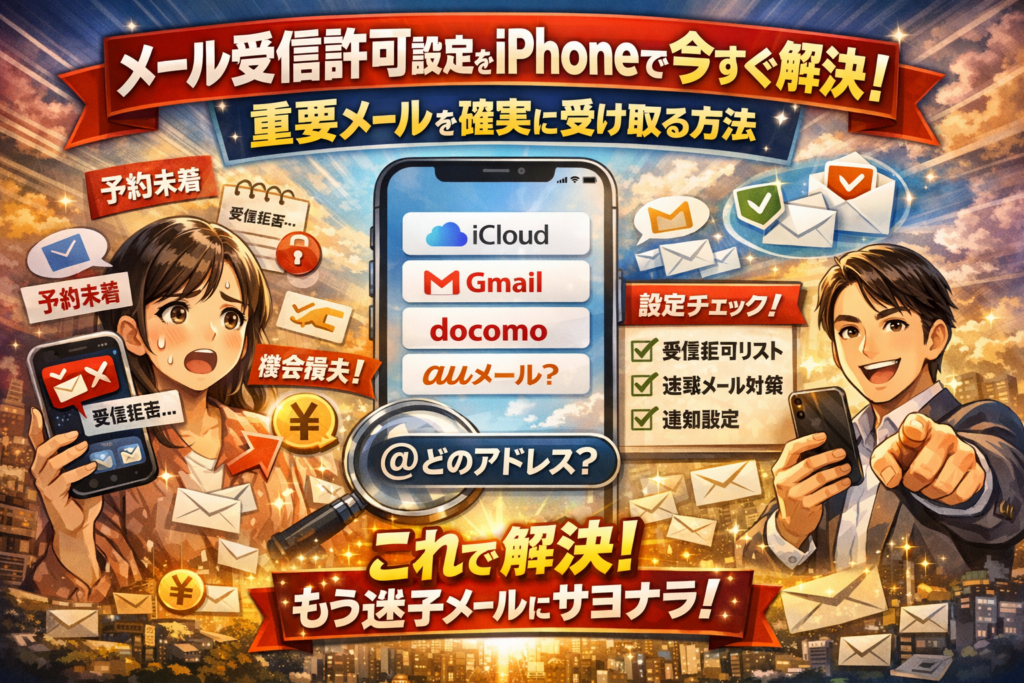 本記事では、まず「メールがどこで迷子になっているか」を切り分け、次に自分のアドレスの正体を一瞬で見分ける方法、さらにiPhone本体、iCloudメール、Gmail、docomo受信許可iPhone、auメール設定、ソフトバンク受信許可リスト設定まで、サービス別に具体的な画面とタップ場所を整理します。それでも届かないケースについては、受信拒否リストへの誤登録やサーバーレベルのブロックなど、現場でしか見えないポイントまで踏み込みます。