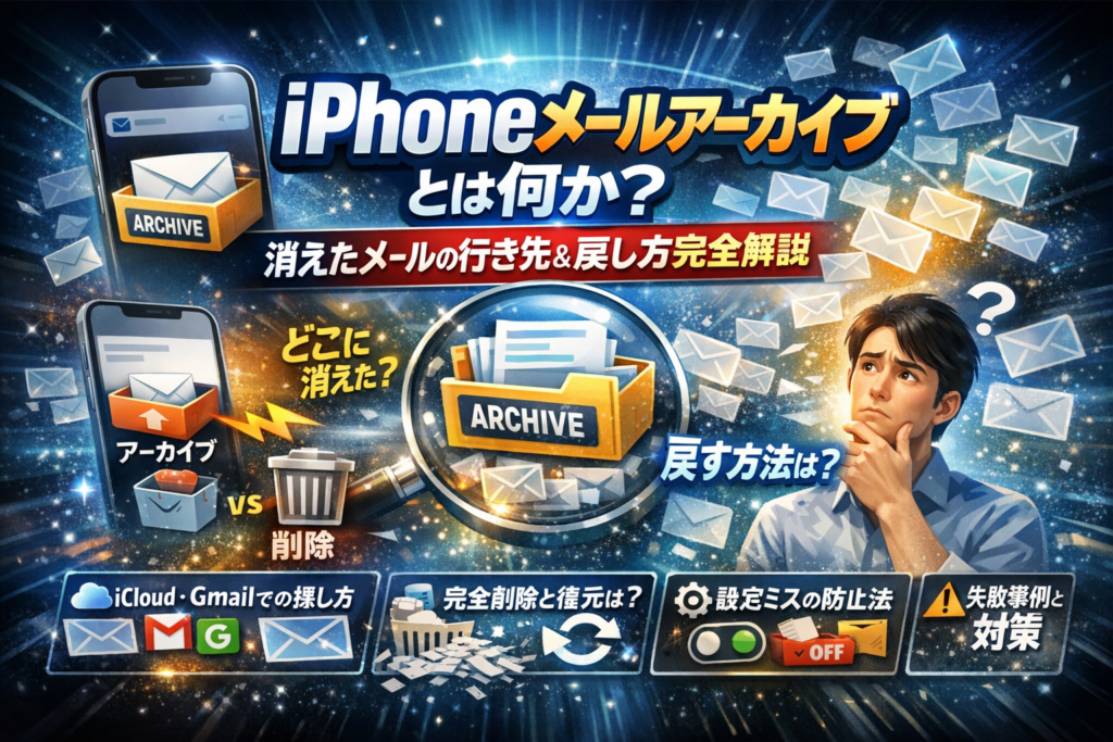 さらに、「iPhoneでアーカイブしたメールを戻す方法」「アーカイブではなく削除にする設定」「勝手にアーカイブされる挙動の止め方」「保存期間や完全削除からの復元可否」まで、よくある再検索ワードを1本の記事で整理します。読み終えるころには、「アーカイブ=怖い機能」ではなく、「受信トレイを安全に軽くし、必要なメールは確実に残すための実務ツール」として、自分のiPhoneに最適な設定と運用ルールを即決できるようになります。