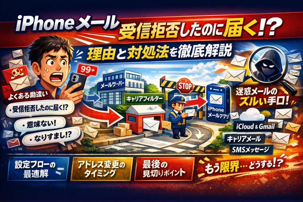 この記事では、「iPhoneメール受信拒否したのに届く」の仕様の正体を郵便局の流れに置き換えながら分解し、iCloudやGmail、SoftBankなどキャリアメール、SMSやメッセージまでを種類ごとに切り分けて原因を特定します。そのうえで、現実的な設定フローと、「ここまで来たらアドレス運用を変える」という妥当な諦めラインまで示します。読み終える頃には、自分の環境で何を変えれば迷惑メールとストレスを最小限に抑えられるかが、数字ではなく手触りのある行動レベルで見えるようになります。