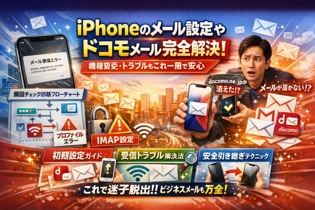 本記事では、症状別フローチャートで今の状態を一発診断し、「初期設定」「機種変更の引き継ぎ」「ドコモメール受信できない・通知こない」「プロファイル・IMAP・持ち運びの違い」まで、迷子にならずに設定を完了させる実務ロジックを整理しました。さらに、店舗代表アドレスをdocomo.ne.jpにしている場合の危険ゾーンや、Gmail・iCloudとの併用で問い合わせを取りこぼさない仕組みまで踏み込みます。iPhoneとドコモメールを「今すぐ安全に使える状態」にしたい方は、ここから先を読み進めてください。