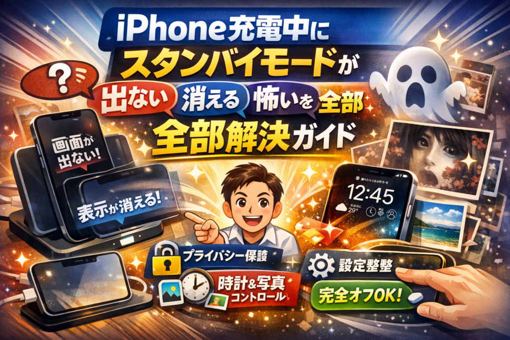 iPhoneを充電中に横向きにしたとき、「変な画面が出る」「スタンバイモードにならない」「時計表示がすぐ消える」「写真が勝手に出て怖い」「赤くなってうざい」と感じているなら、そのまま放置するほど損をしています。多くの解説は「スタンバイモードの概要」と「基本設定」で終わりますが、実際に困るのは出ない・消える・怖い・うざい・解除できないといった細かい挙動と、対応機種や常時表示の限界、プライバシーやバッテリーへの不安です。この記事では、iPhoneを充電中にスタンバイモードがならない原因を条件ごとに切り分け、時計表示や画面が消える問題を機種差と設定から整理し、写真スライドショーの完全オフや写真非表示、色変更やナイトモードまで一度で迷いなく調整できる手順だけを載せています。さらに、ベッドサイドや職場、キッチンなどシーン別に「見られて困る写真を出さない設定」と「スタンバイモード自体をシンプルに解除する方法」、常時表示できる機種とできない機種の現実的な線引きも明示します。読み終える頃には、「iPhoneを充電中のスタンバイモード」を怖がる必要も、うざがりながら我慢する必要もなくなり、自分でオンオフとカスタマイズをコントロールできるはずです。