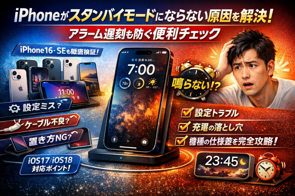このページでは、iPhone16や15、14 Pro、SEや12など機種ごとの「できること/できないこと」をはっきり線引きしつつ、iPhoneスタンバイモードがならない原因を「設定」「物理条件」「iOS17・iOS18の仕様」の3軸で切り分けます。充電中にスタンバイモードにならない、スタンバイ中のアラームが鳴らない不安、スタンバイが怖い・うざい・いらない時の解除や完全オフ、時計だけ表示や常時表示“裏ワザ”まで一気に整理します。この記事を読み進めれば、自分のiPhoneでどこまで安定したスタンバイ運用ができるか、そして遅刻リスクを避けながら安心してベッドサイド時計として使えるかが、数分で判断できるようになります。