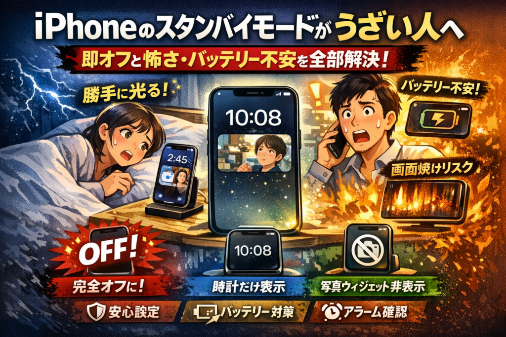 iPhoneのスタンバイモードが勝手に立ち上がり、夜中に画面が光ったり写真や顔が急に表示されて「うざい」「怖い」「もういらない」と感じているなら、そのまま放置するほど損をしています。多くの解説は「スタンバイモードとは」「対応機種」「設定や解除のやり方」といった一般論で終わりますが、実際のストレス源は、ベッドサイドでの常時表示、会議中の横向き通知、アラームが鳴らない不安、バッテリー劣化や画面焼けへの疑心といった生活シーンごとの具体的トラブルです。この記事では、まず「今すぐ完全オフ」「充電中だけ出さない」「時計だけ表示」といった実務レベルの解除ルートを示し、そのうえでバッテリー寿命や画面焼けのリスクを線引きしながら、本当に避けるべき条件だけを抽出します。さらに、スタンバイモードでアラームが鳴らないと言われる裏側の設定競合や、写真ウィジェットが勝手に出て恥ずかしい問題を、現場で多い相談パターンに沿って潰していきます。「iPhone スタンバイモード うざい」と検索した時点で、機能に振り回される側に回っています。本記事を読み進めれば、完全オフから必要最低限のカスタマイズ運用まで、自分で主導権を握るための最短ルートだけを拾って設定を終えられます。